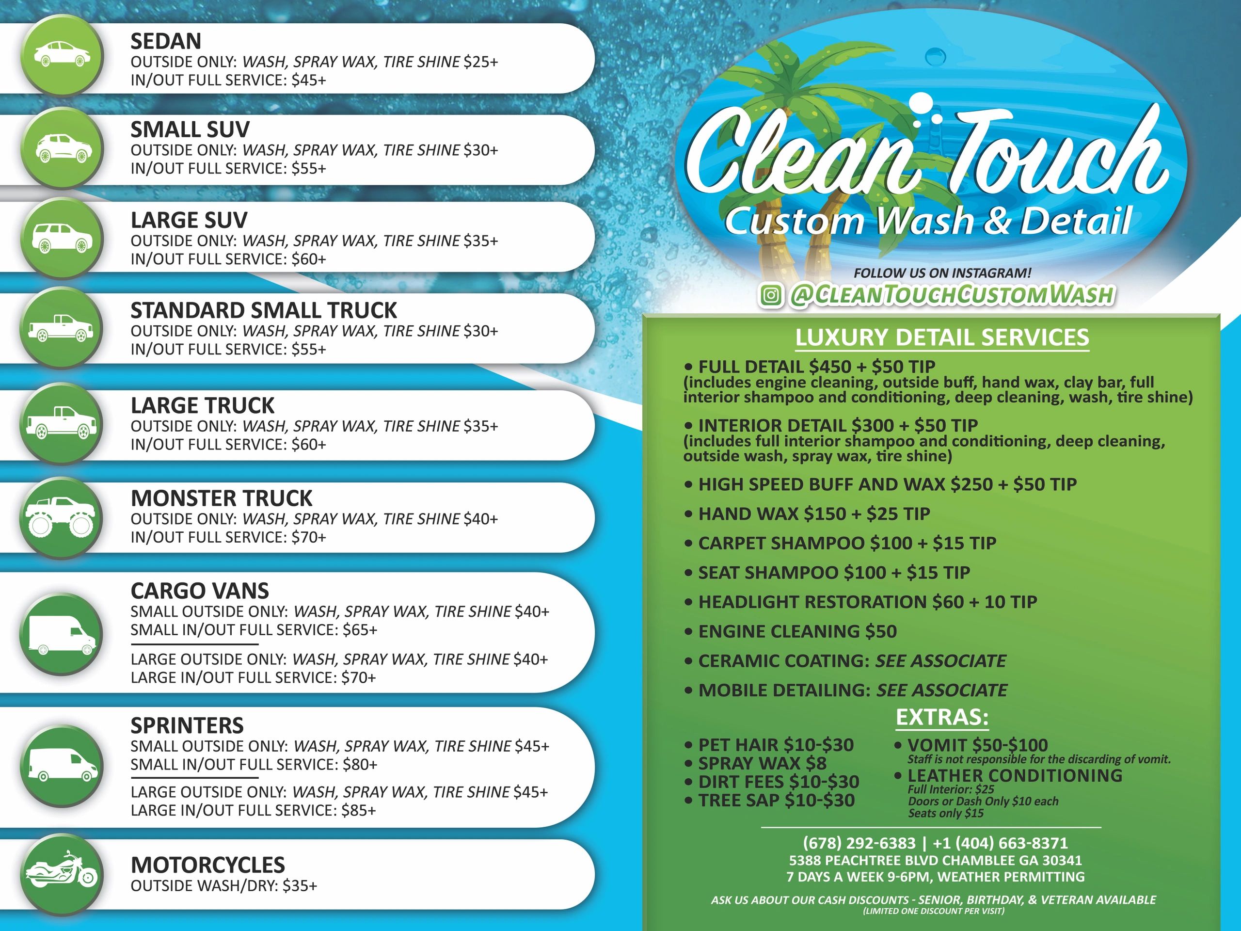 Please be sure to review the menu that best fits your needs so you can choose the perfect service for your vehicle. For any questions, please call or email us at: 404-663-8371 / Cleantouchcustomwash@gmail.com